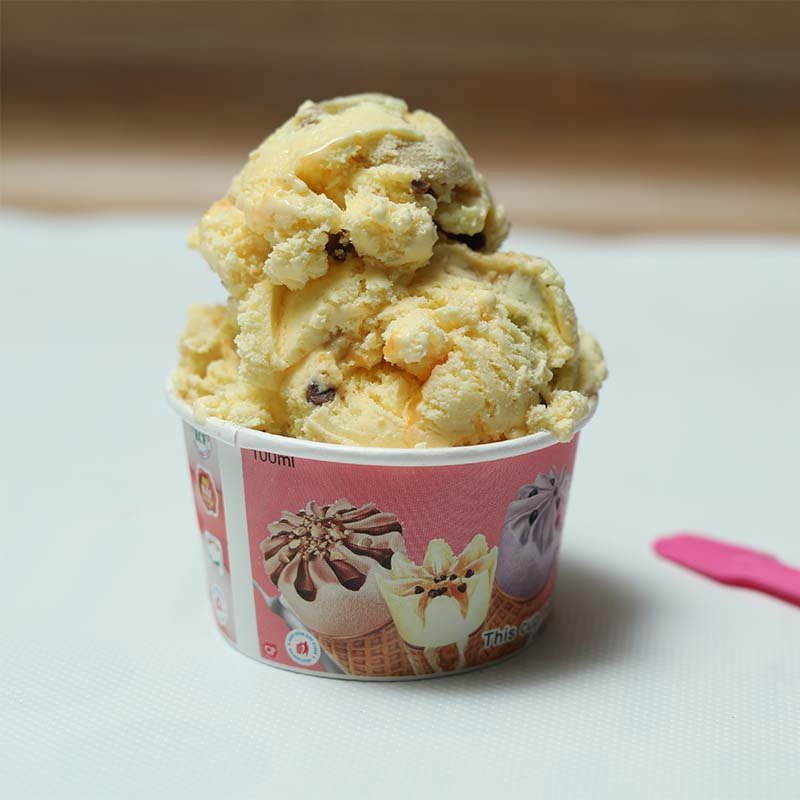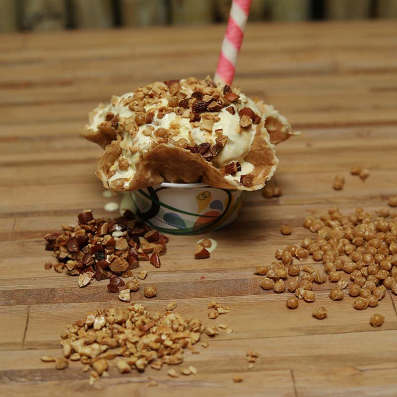 Mixture of Royale Vanilla,Butterscotch Ice Cream,Roasted Almonds,Roasted Cashew and Caramel Topping