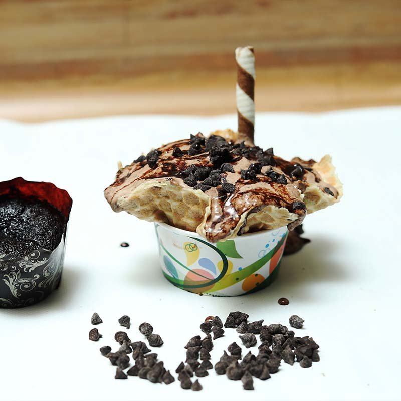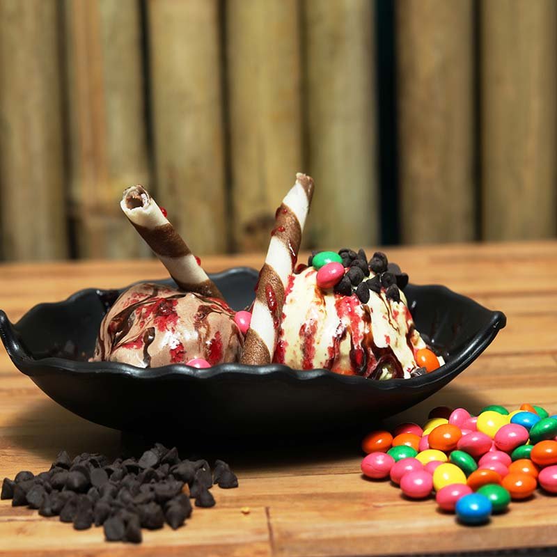 Base with Hot Chocolate,Truffle Cake,topped with Two Scoop of Chocolate Ice Cream and Single Scoop of Royale Vanilla,Chocolate Sauce and Choco Chips