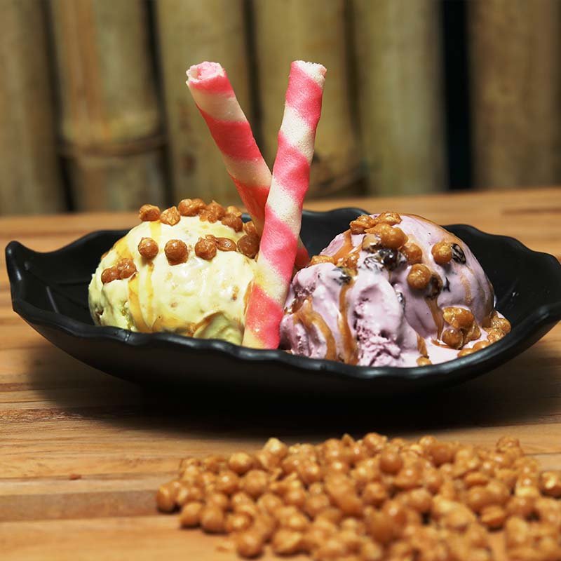 Combination of Roasted Almond Ice Cream ,Kaju Draksha with topping of Caramel Sauce and Roasted Almonds and Cashew Nuts.