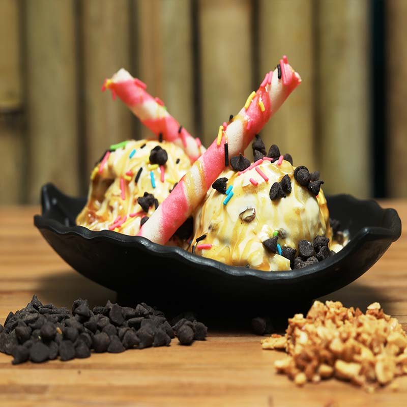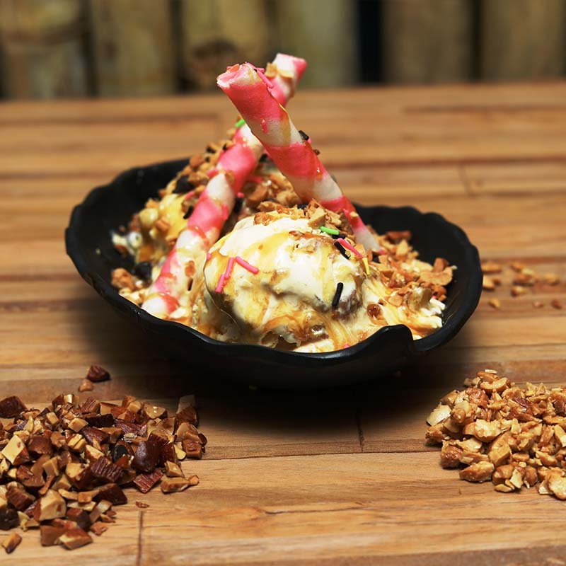 Combination of Butterscotch,Black Currant with topping of Chocolate Sauce and Butterscotch Nuts.