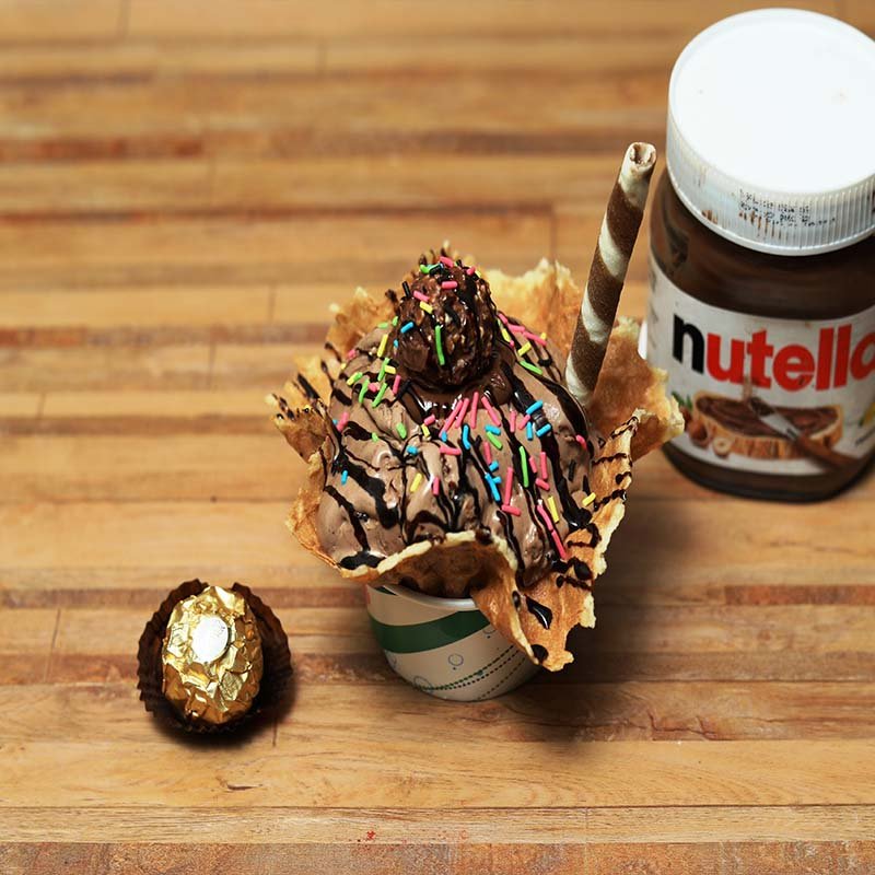 Mixture of Chocolate Ice Cream, Nutella Paste,Choco Stick,Cashew Nuts & topped with Ferrero Rocher