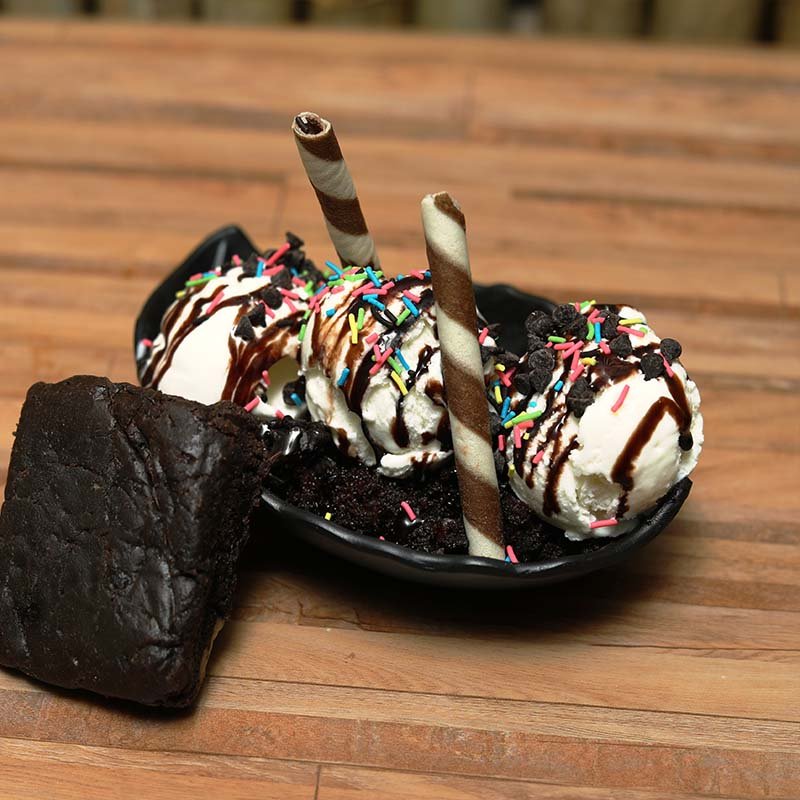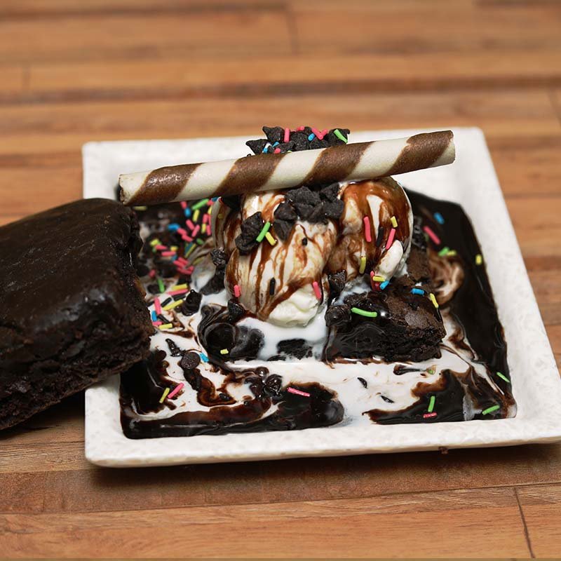 Base of Hot Mash Brownie with the triple Scoop of Chocolate Ice Cream ,Chocolate Sauce and Choco-Chips.