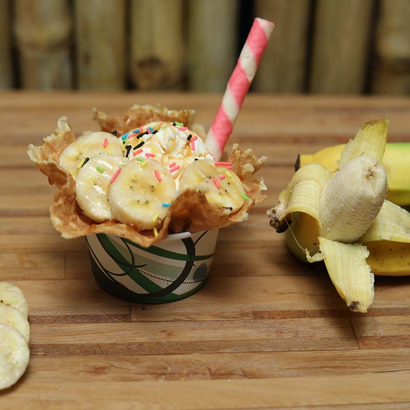 Mixture of Royale Vanilla,Banana Fruit,Caramel Sauce and Cashew Nuts and topped with Caramel Suace and Banana.