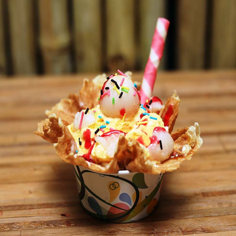 Mixture of Stawberry, Fresh Litchi Ice Cream, Real Apple Fruit,Kiwi,Litchi and topped with Real Fruits and StrawberrySauce