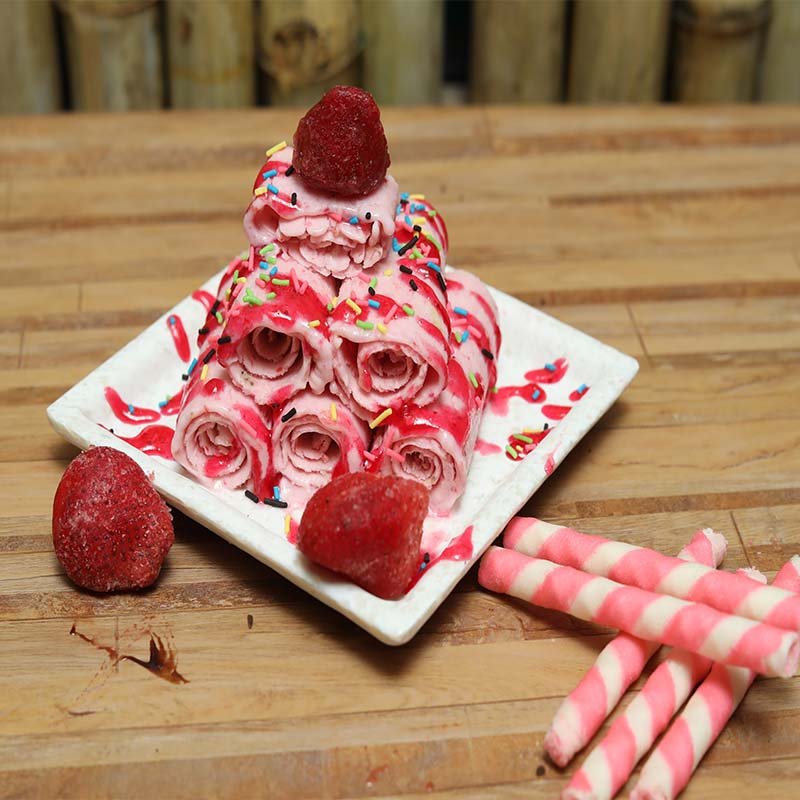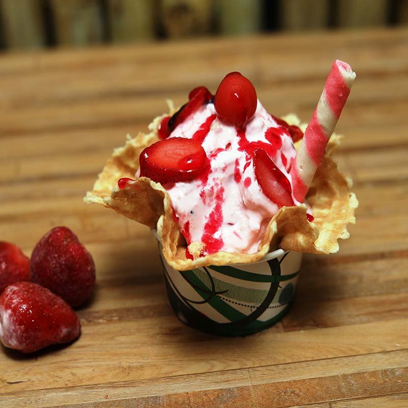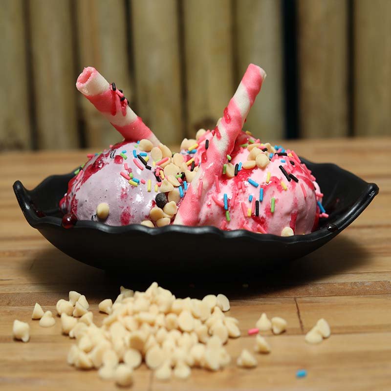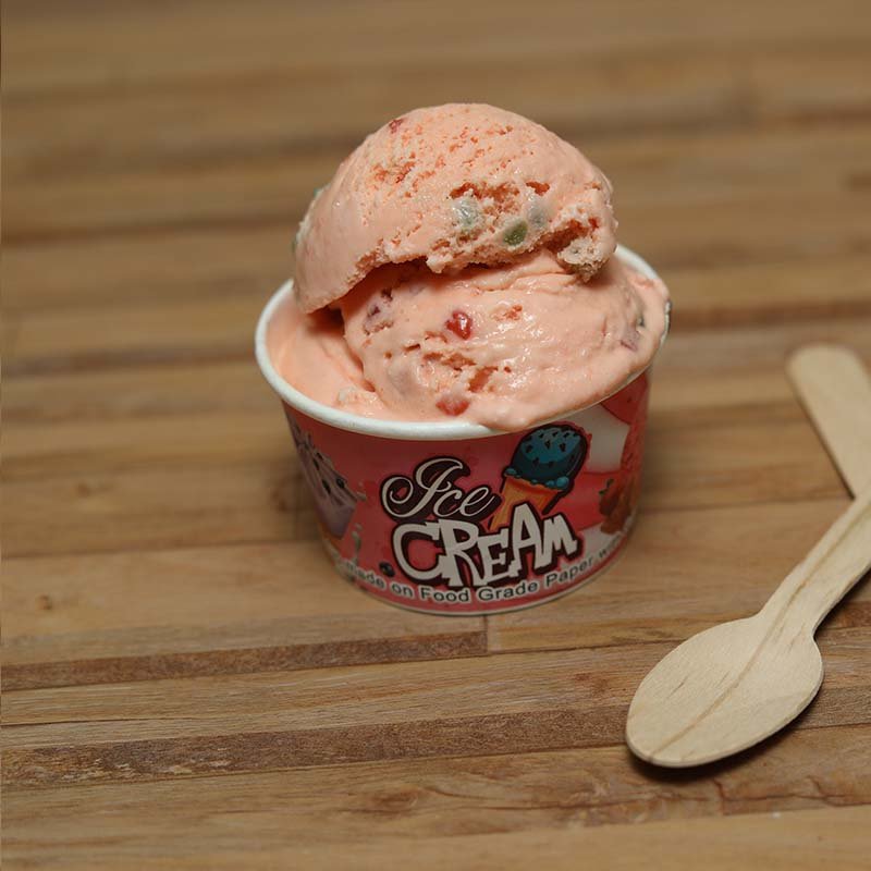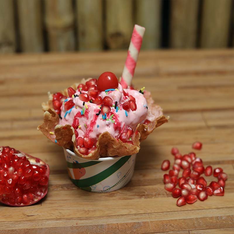 Mixture of Strawberry, Tutti-Fruity Ice Cream,Natural Pomegranate,Strawberry Stick and topped with Pomegranate.