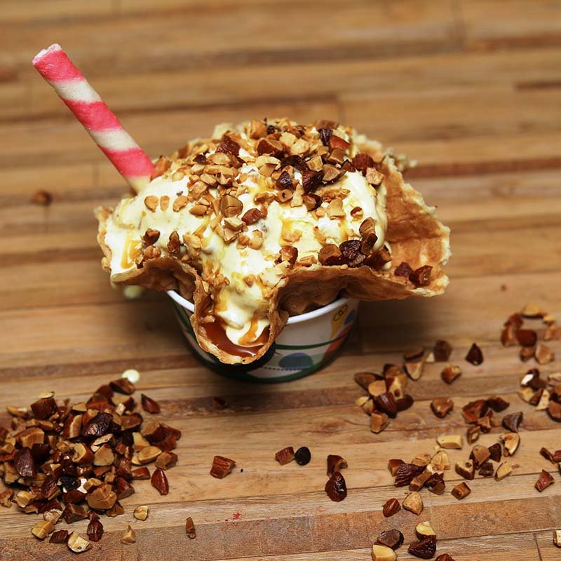 Scoop of Butterscotch,Perk Chocolate,Roasted Almond,Roasted Cashew Nuts and Caramel Sauce