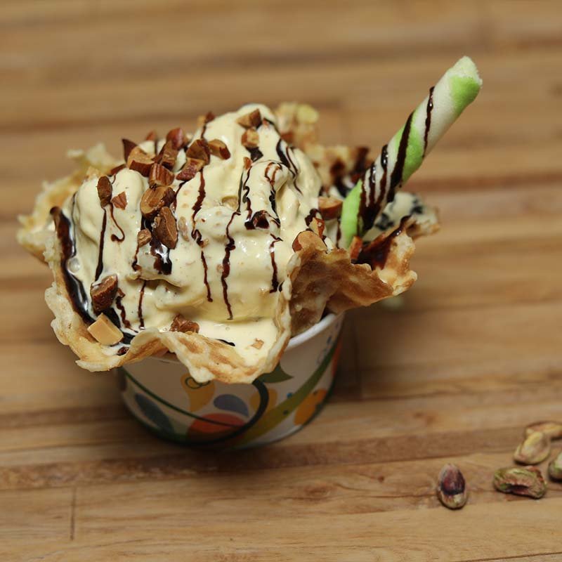 Mixture of Choclate Ice Cream,Walnut Brownie,Roasted Almond,Hot Fudge and Topped with Roasted Almonds