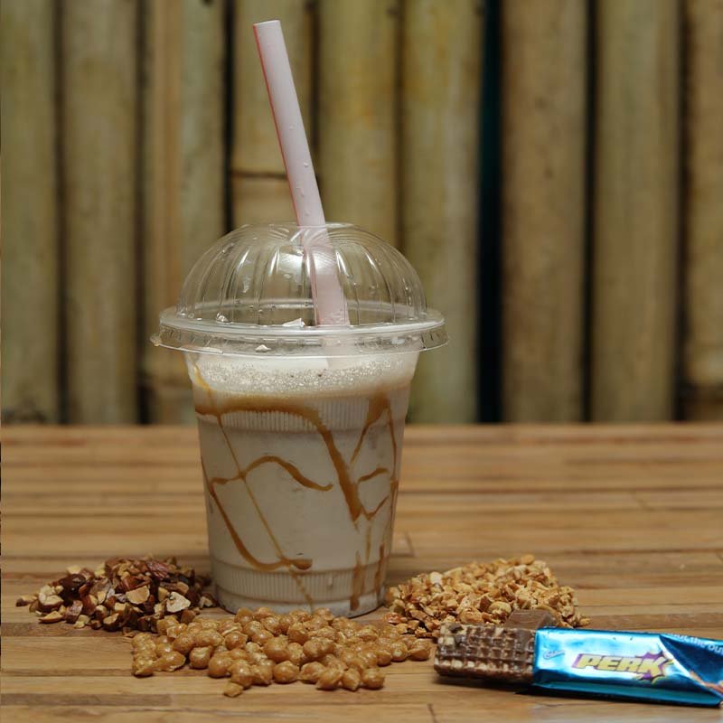 Mixture of Royale Vanilla,Peanut Butter Paste,Caramel Sauce,Milky Chips topped with Caramel Sauce and MilkyChips.